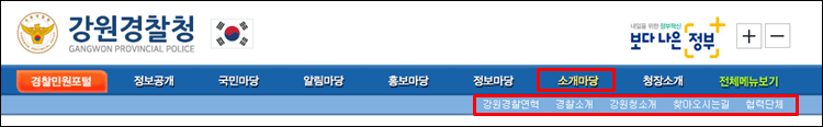 강원경찰청 홈페이지를 방문하시면 아래와 같이 소개마당메뉴를 보실 수 있습니다.