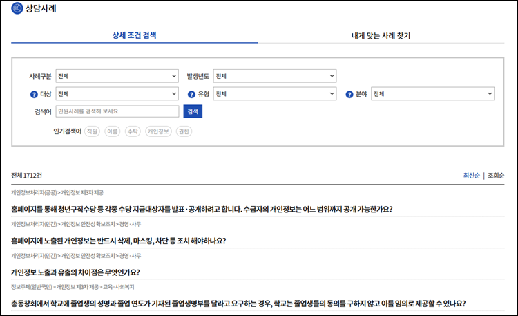 - 상담사례: 개인정보 관련 사례를 DB화하여 정보주체, 개인정보처리자, 분야별(금융, 보건 등)로 검색 가능.