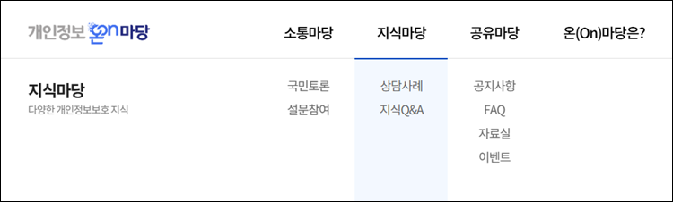 - 지식 Q&A: 개인정보 관련 법적 애로사항 및 일상 속 문제를 자유롭게 질문하고 답변을 받을 수 있는 공간.