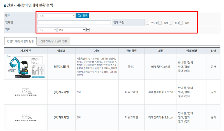 건설기게 e마당을 방문하시면 아래와 같이 건설기게와 장비 임대차 현황을 검색해 보실 수 있습니다.
