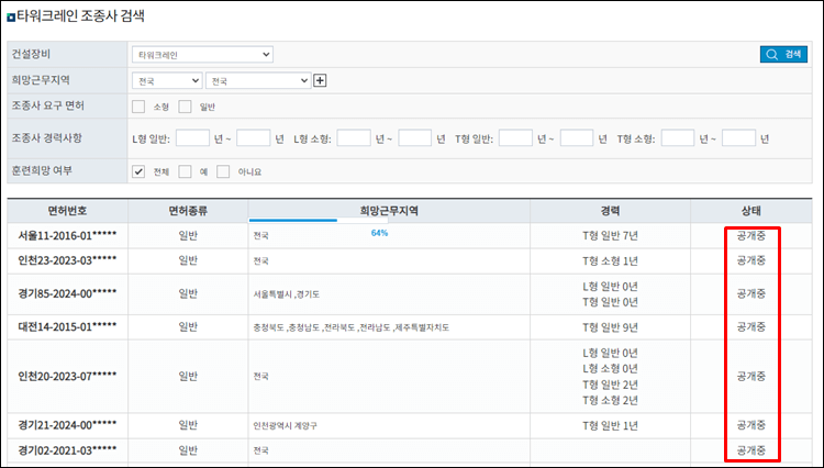 건설장비에 타워크레인이 있는 것을 확인하시고 희망근무지역과 조종사 면허, 경력, 훈련희망여부를 선택 후 검색하면 아래와 같이 면허번호와 종류, 희망근무지역, 경력이 나오게 됩니다.