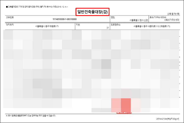 아래처럼 갑지가 나오는 모습을 볼 수 있습니다. 건축물대장 갑지에는 건축물에 대한 소재, 지번, 도로명주소 등 사실관계들이 적혀있습니다.