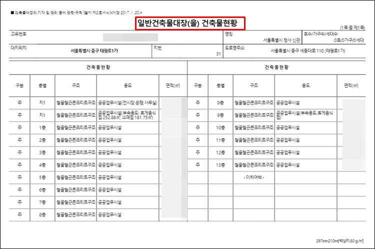 건축물대장 을지에는 구조와 용도, 면적 등이 적혀있습니다.