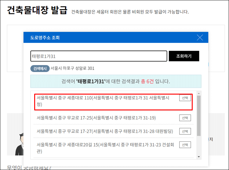 건축물대장 발급을 위해 도로명주소 조회칸에 원하시는 주소를 입력하고 조회하세요.