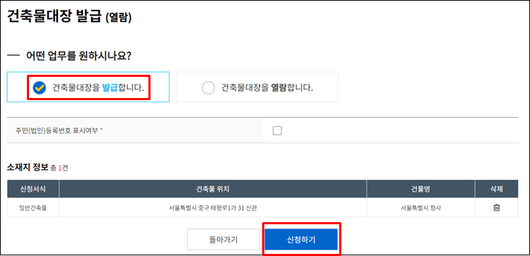 일반건축물에 2건이 검색되었는데요 원하는 건축물을 선택하고 신청할 민원에 담고 신청하시면 됩니다.