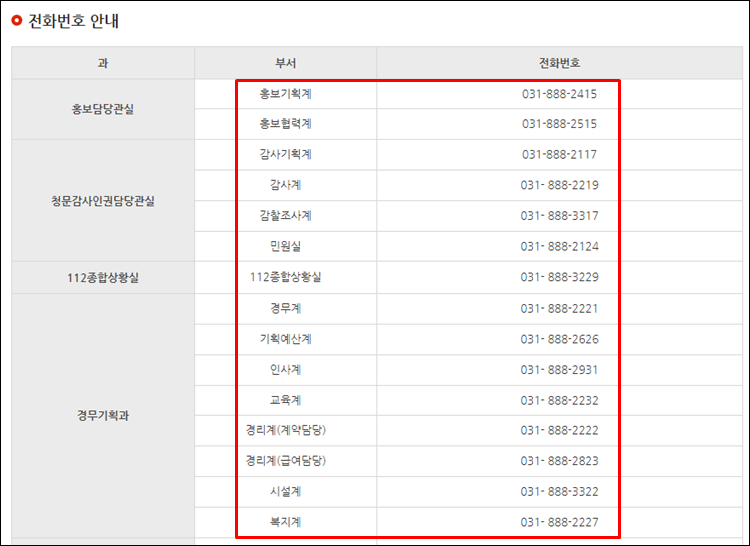 경기남부경찰청 부서에서 부서를 보셨다면, 스크롤을 조금만 더내려 전화번호를 찾아보실수 있습니다.