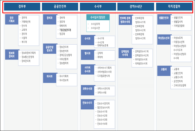 - 수사부 : 수사과, 형사과, 사이버수사과, 과학수사과, 안보수사과