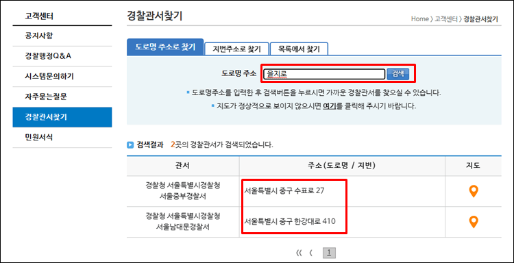 고객센터메뉴에서 경찰관서 찾기를 누르셔서 도로명주소로 해당 관서를 찾으실 수 있습니다.