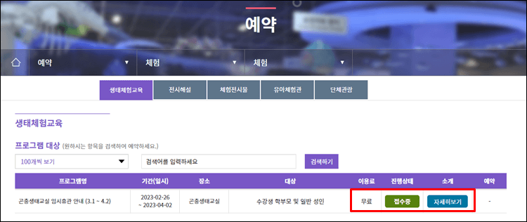 접수가 필요하신 분들은 자세히 보기를 하신 후 예약버튼의 예약을 누르시면 됩니다.