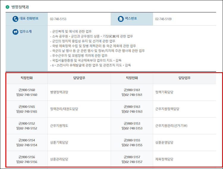 병영정책과를 클릭해 보면 아래와 같이 대표전화번호와 팩스번호, 업무소개가 나오는 것을 보실 수 있습니다.