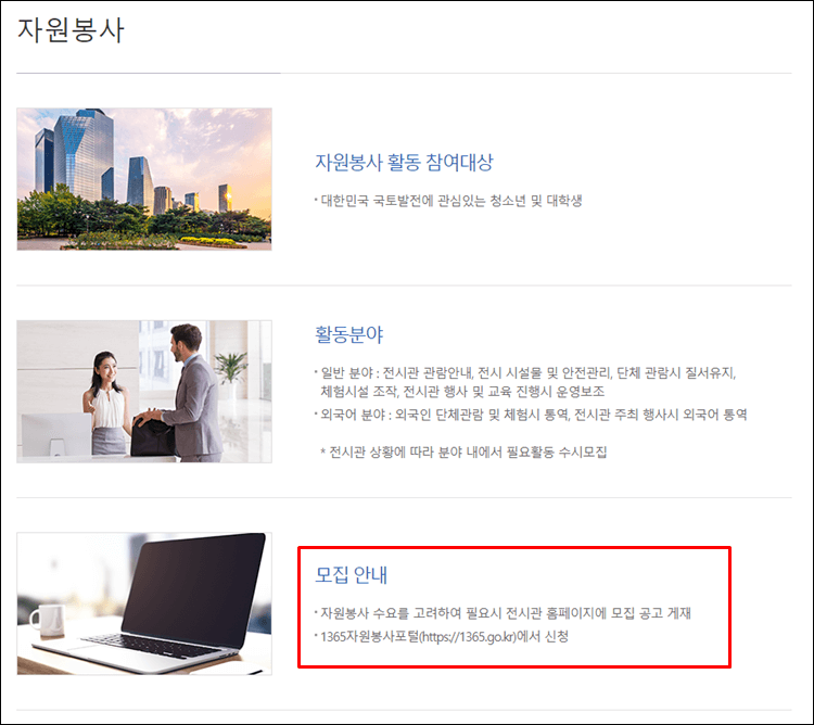 국토발전전시관 자원봉사는 대학생까지 지원이 가능하며 현재 1365 자원봉사 포털에서 신청해 보실 수 있습니다. 수요가 있을 때만 신청공고가 나므로 이 또한 한 번 더 확인은 해보셔야 합니다.