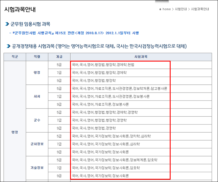 3. 군무원 시험과목 안내