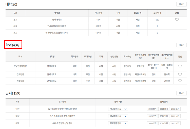 이렇게 메인 페이지에서 학교정보를 볼 수 도 있지만, 메뉴에 대학별 학과 정보를 서택 하시고 학교명을 검색해보세요. 더욱 다양한 정보가 나오게 됩니다.