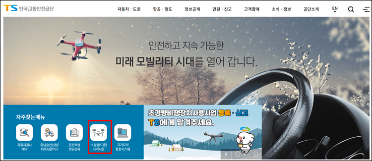 한국교통안전공단 홈페이지를 방문하시면 드론자격시험을 응시할 수 있는 메뉴가 보이실 겁니다.