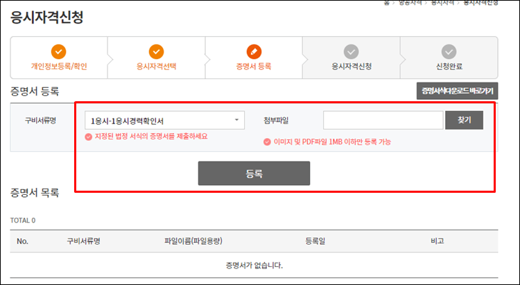 구비서류를 입력하시고, 첨부서류를 등록하시면 신청준비가 끝납니다.