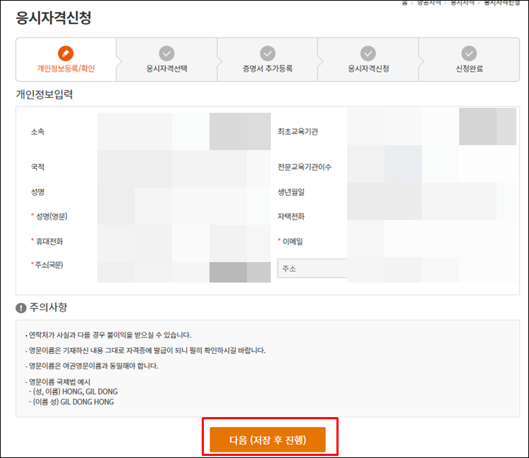 신청하기 버튼을 누르셨다면 다음은 진행사항에 따라 입력하시기 바랍니다.