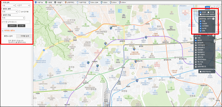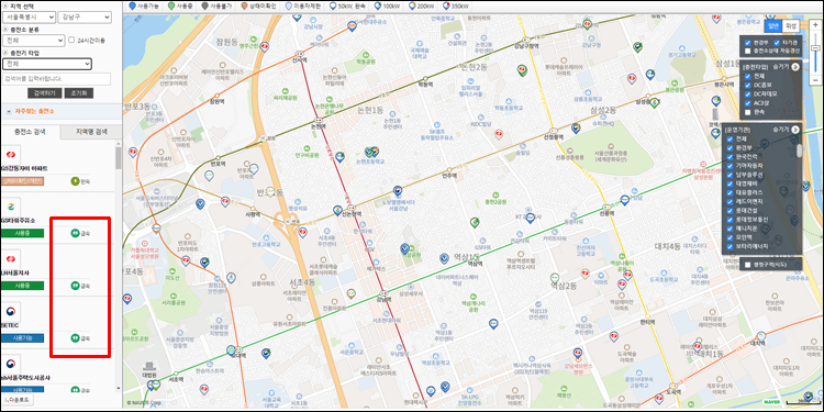 혹은 좌측에 지역을 검색하고 급속 마크가 있는 곳을 찾으시면 충전이 가능합니다.