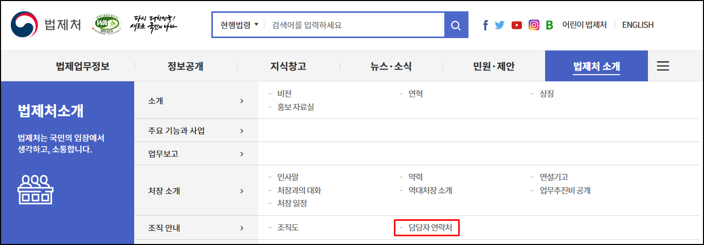 법제처 홈페이지 조직도 및 담당자 연락처 바로가기
