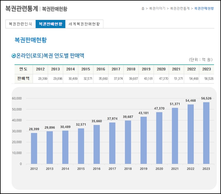 A: 복권 판매액은 매년 증가하는 추세로, 2023년에는 약 56,526억 원의 판매액을 기록했습니다.