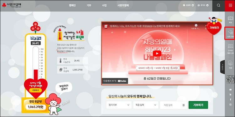 사랑의 열매 메인화면에서 우측 에보시면 나의 기부 아이콘을 보실 수 있습니다.