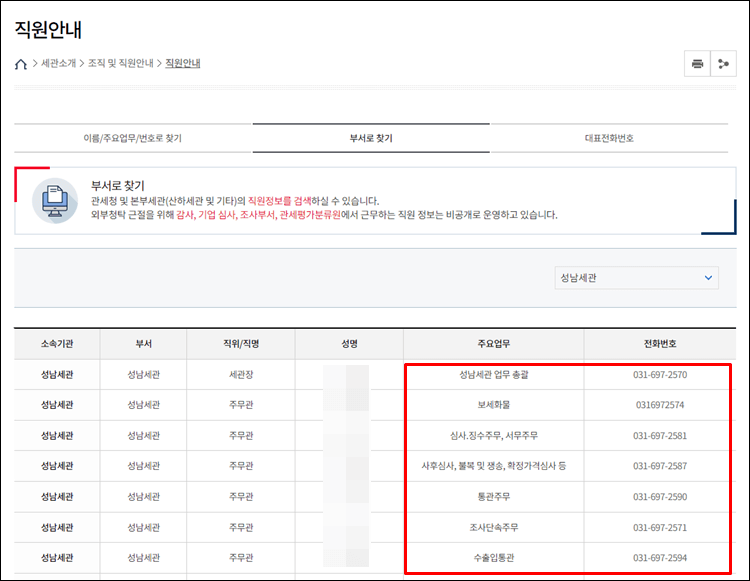 오늘은 성남세관 홈페이지에서 조직도와 직원 전화번호를 조회해보았습니다.