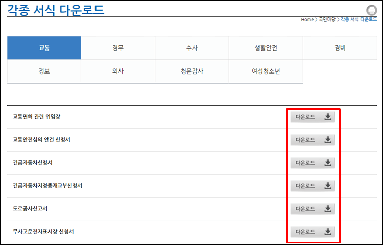 또한 세종경찰서 홈페이지에서는 아래와 같이 민원서식도 다운로드하실 수 있습니다.
