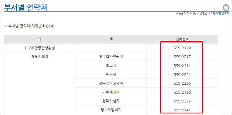 2. 세종경찰청 부서별 연락처 조회