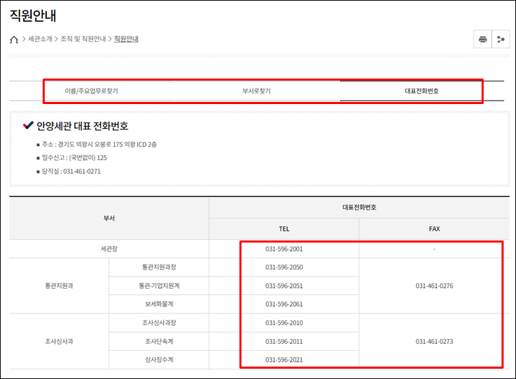 오늘은 안양세관 홈페이지에서 부서안내와 전화번호를 조회해 보았습니다.
