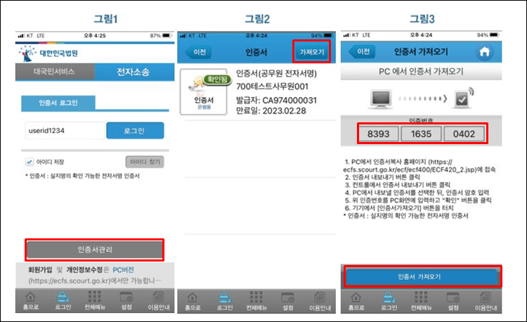 대한민국법원 어플을 실행하면, 아래 그림 1처럼 인증서관리가 보이실 겁니다.