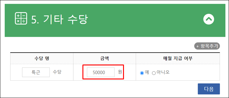위에서 말씀드렸던 수당 외에 기타 수당이 있다면 수당명칭과 금액을 입력하시기 바랍니다.