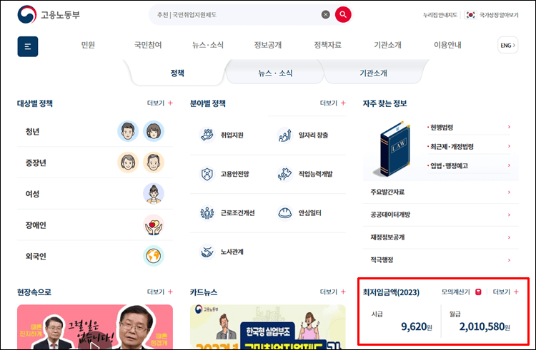 고용노동부 홈페이지를 방문하시면 아래와 같이 메인화면 우측하단에 최저임금액과 모의계산기를 확인해 보실 수 있습니다. 모의계산기를 눌러보세요.