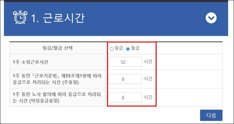 근로시간에는 일급과 월급을 선택하며, 1주 소정근로시간을 입력합니다.
