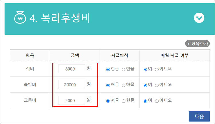 본인이 받는 수당을 모두 등록하시고 다음으로 넘어가시기 바랍니다.