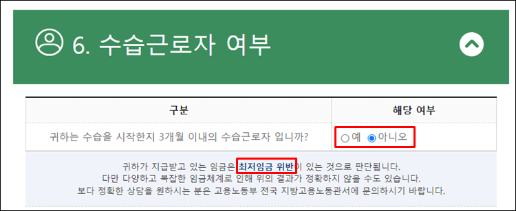 1번부터 6번까지 입력하시고 최저임금 계산을 누르시면 위반인지 아닌지 확인하실 수 있습니다.