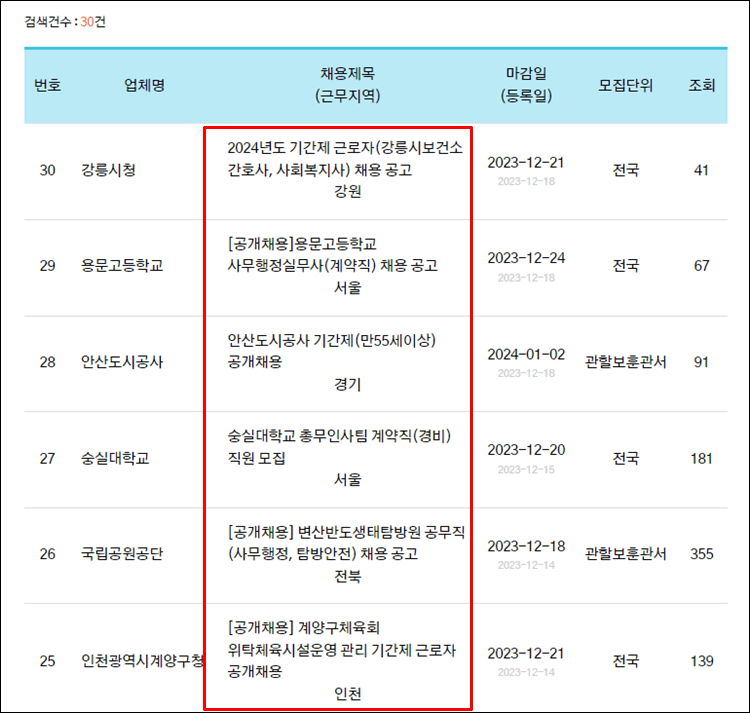 아래와 같이 현재 30건의 구인구직정보가 있는 것을 보실 수 있습니다.
