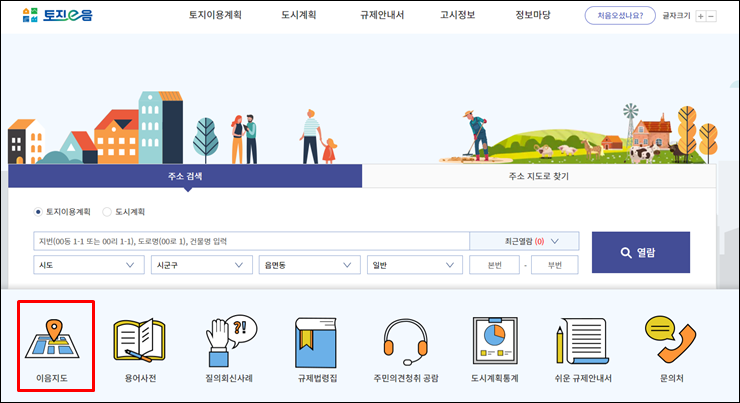 토지이음에서는 아래와 같이 지번 혹은 도로명주소를 검색할 수 있는 창이 있습니다.