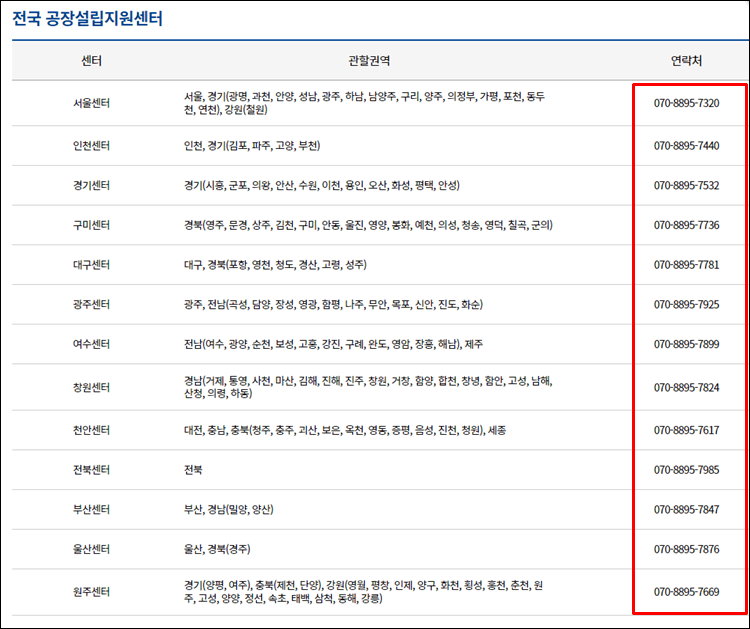 하지만, 이렇게 인터넷상에서 이용하기가 어려우신 분들이라면 아래와 같이 전국의 공장설립지원서비스 지원센터의 연락처로 전화를걸어 방문예약을 하시거나 전화상담을 진행해보실 수 있습니다.