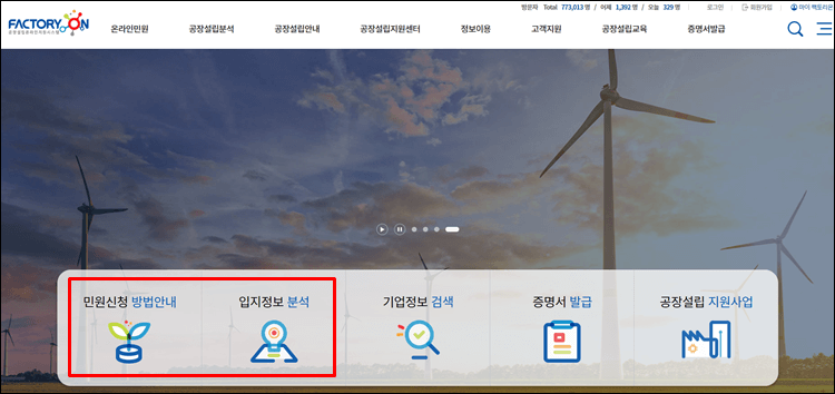 팩토리온 공장설립지원센터 홈페이지를 방문하시면 아래와 같이 민원신청, 입지정보분석 서비스를 살펴볼 수 있습니다.