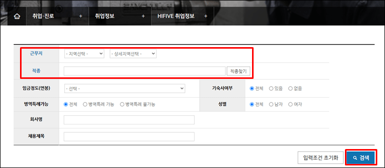 두 가지를 선택했다면 바로 검색하셔도 되고, 아래의 희망연봉, 병역특례, 기숙사여부, 성별 등을 추가로 선택하고 검색하셔도 됩니다.