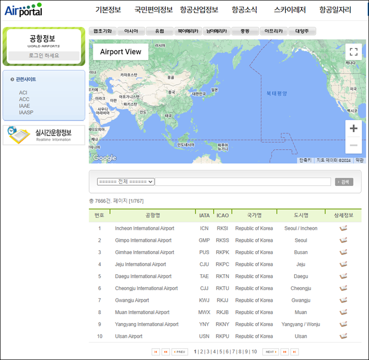 항공정보포털시스템에서 공항정보를 누르시면 아래와 같이 모든 나라의 공항명과ㅏ iata, icao, 국가명, 도시명을 살펴볼 수 있습니다.