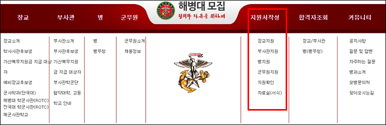 해병대모집 홈페이지를 방문하시면 아래와 같이 지원서작성 메뉴를 보실 수 있습니다.