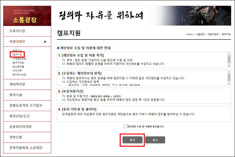 해병대 캠프를 지원하는 법은 소통광장의 해병대캠프 지원을 클릭하시면 됩니다.