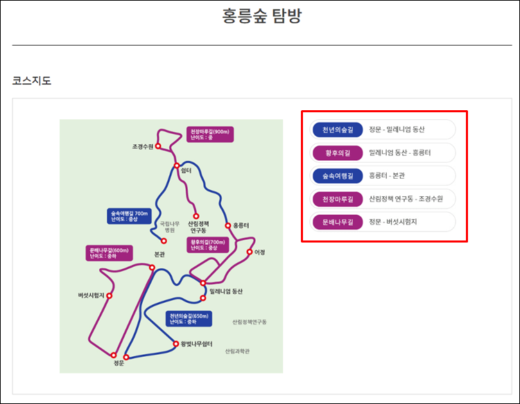 홍릉숲은 아래와 같은 코스로 이루어져있습니다.