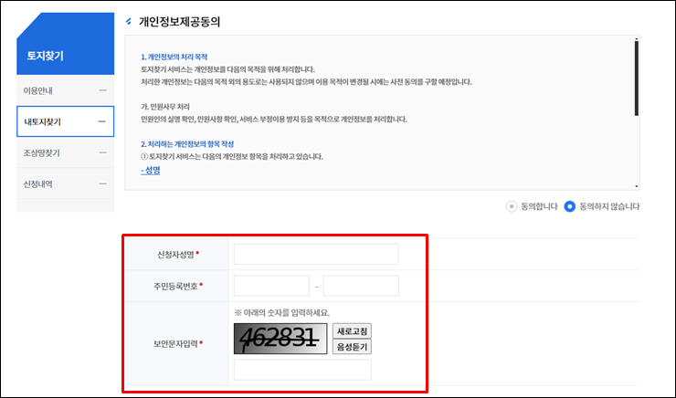 아래에서 보시다시피 신청자 성명을 입력하고 주민등록번호, 보안문자를 입력하면 서비스를 이용하실 수 있습니다.